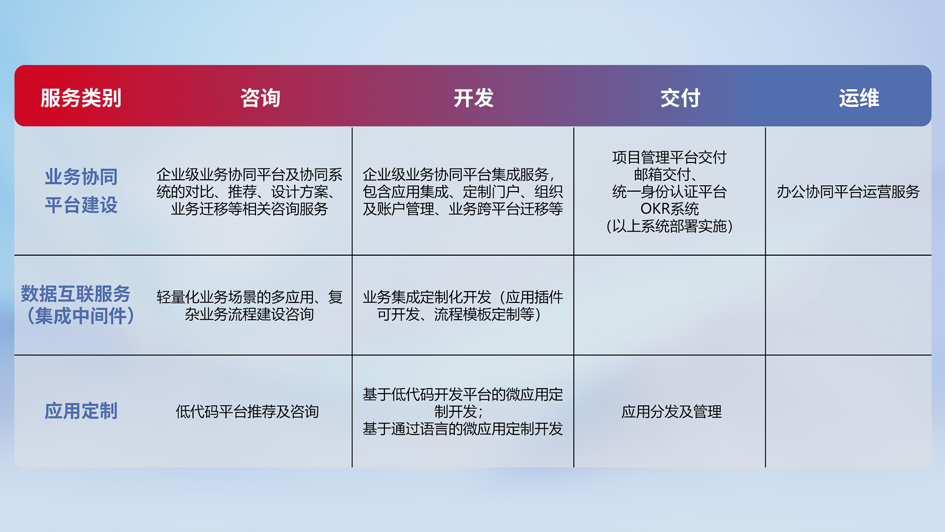 针对钉钉、、企微、、、、IDaas等平台级产品提供产品的规划、、、、方案、、交付、、、、定制化开发等服务,,实现如统一协同办公、、、智能客户服务、、、混合会议管理、、、智能数据查询、、、等业务场景,,,,实现数字化转型。。